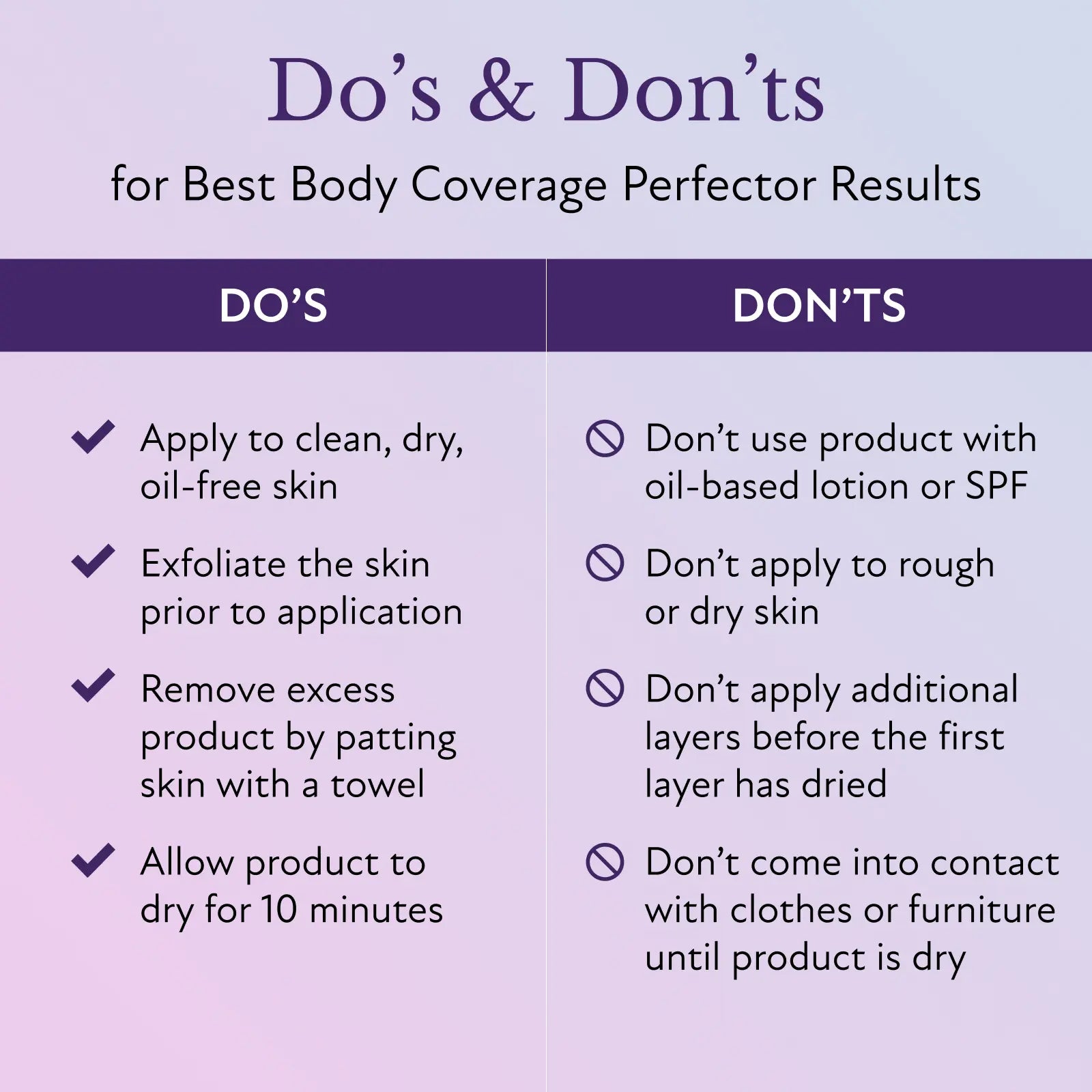 Remember: after each application, use a tissue, makeup sponge or our Dual-Action Mitt to remove any excess product. Then, allow the final layer to fully dry for 10 minutes before putting on clothing.